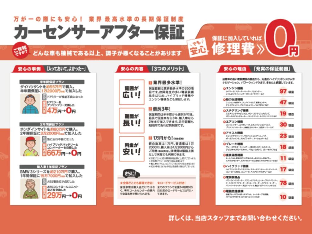 EGSスタンダードプラン6か月保証を適応いたします。全国対応できますのでご安心ください。保証内容は保証箇所のイラストにて確認できます。黒文字、青文字がスタンダードプラン、黒文字、青文字、赤文字すべての項目がプレミアムプランとなります。ロードサービスも付帯しております。プランのグレードアップ、期間延長等もできますのでお問い合わせください。